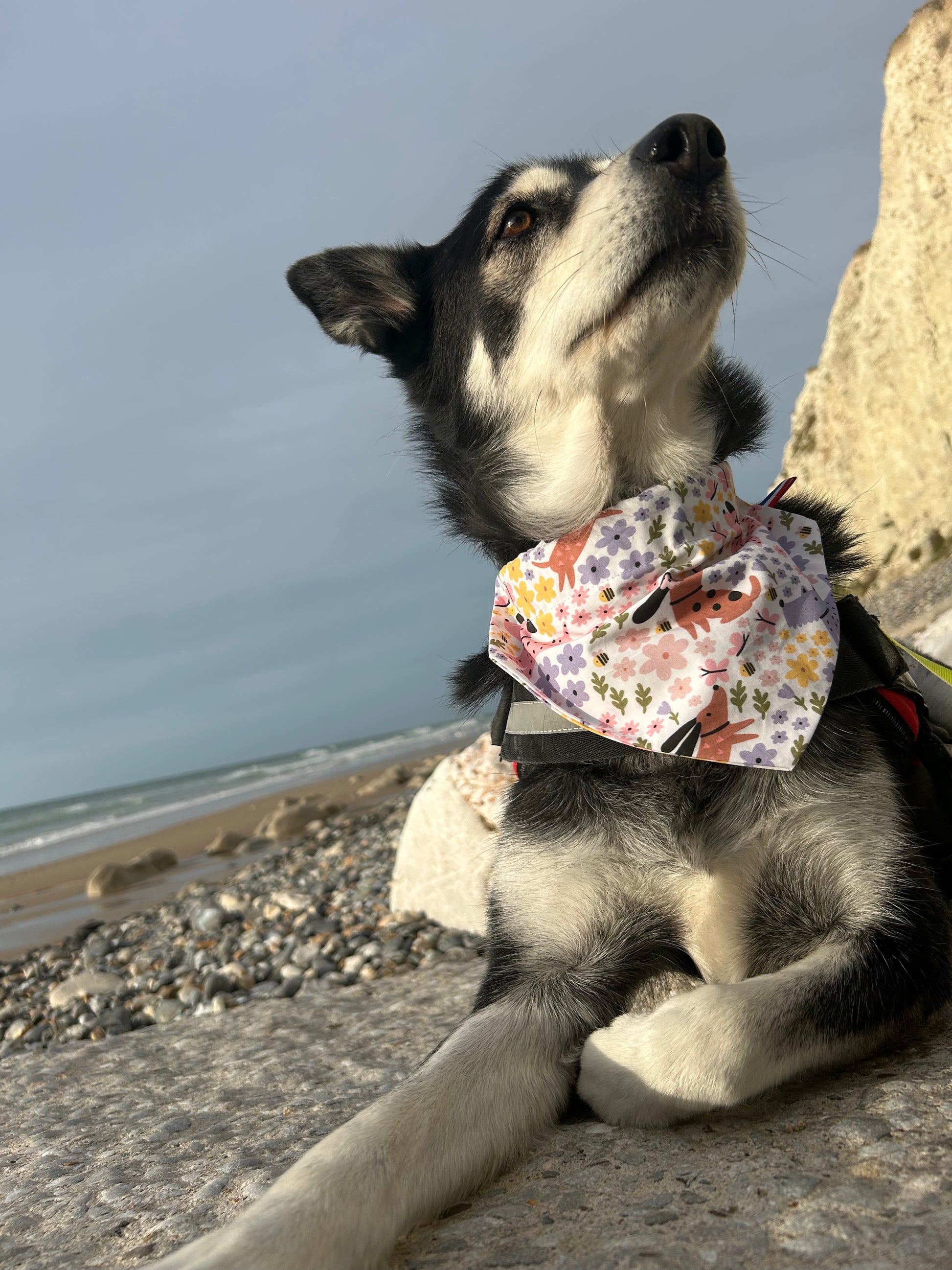 Apportez une touche de fraîcheur et de gaieté au look de votre compagnon avec ce bandana motif Printemps, confectionné à la main dans notre atelier en Normandie.