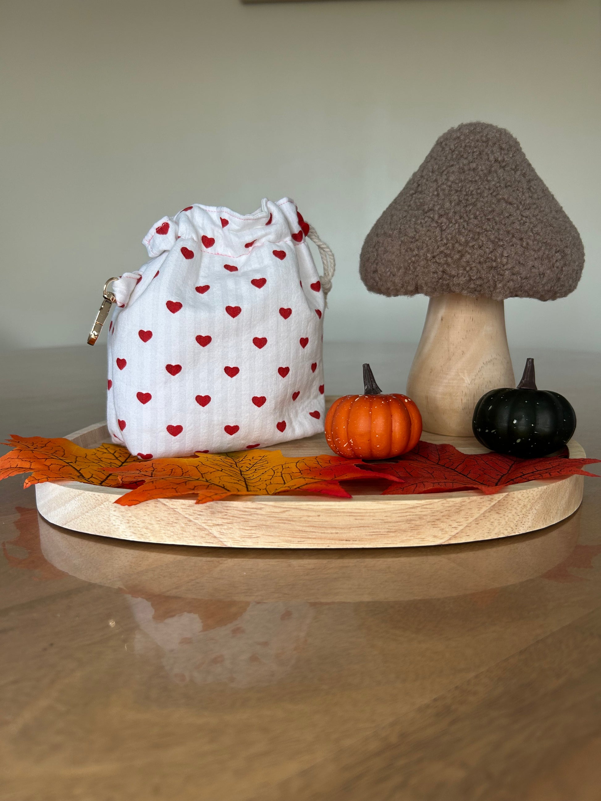 Un pochon motif st Valentine , fun et pratique, fabriqué avec amour pour des balades stylées, bien organisées et pleines de bonne humeur 🐾🧡